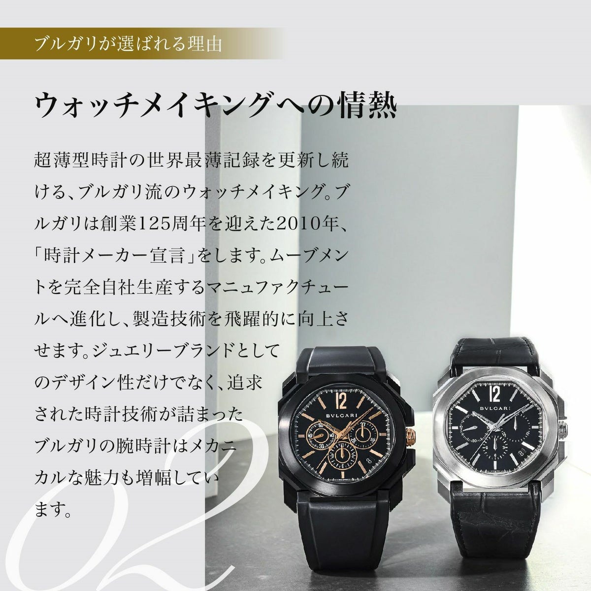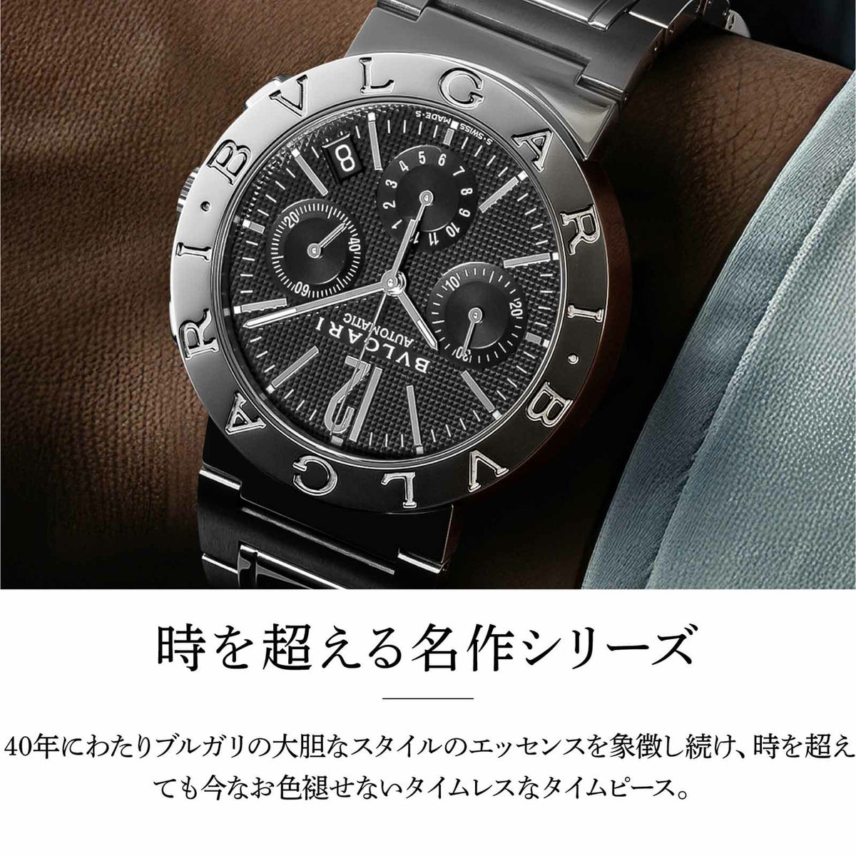 銀細工職人であったソリティオ・ブルガリによって1884年に永遠の都、ローマで創業された。卓越したクラフツマンシップと素晴らしいジュエリーの創造力によって瞬く間に名を馳せた。1977年、現在もアイコンである「ブルガリ・ブルガリ」を皮切りに時計界へと参入。1982年には本格的に参入するためスイスに製造拠点を設けた。天才時計デザイナーとされるジェラルド・ジェンタ氏の自らの名を冠したジェラルド・ジェンタやダニエル・ロートを傘下にし、2010年には時計メーカー宣言を果たした。完全自社製ムーブメントやジュエリーブランドらしいハイセンスなデザインが光る。人気モデルにはアイコンである「ブルガリ・ブルガリ」や円と正方形を大胆に融合させた「オクト」、山下智久さんが着用したことでも注目を浴びた革新的な素材と比類ないイタリアンデザインが混ざり合うアルミニウムコレクションがある。