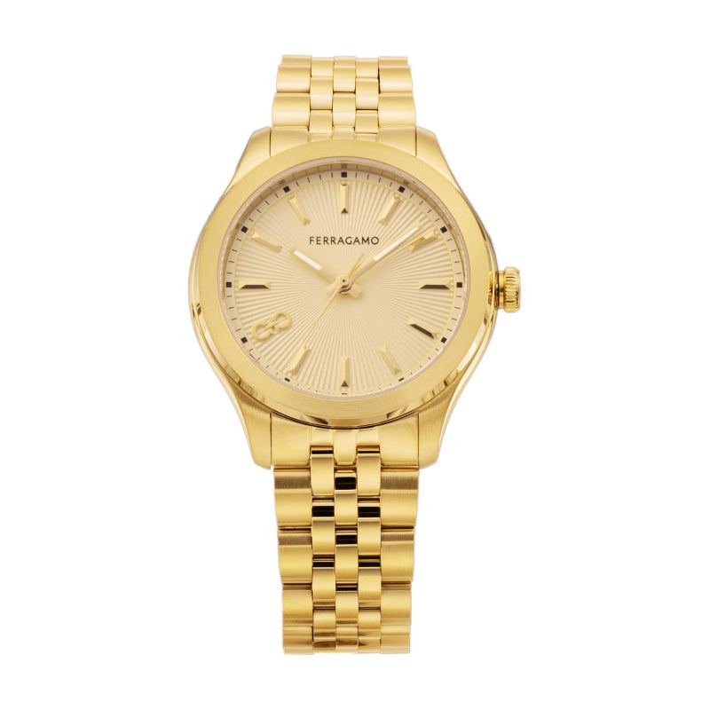 ケースデザインにはブランドのアイコンであるガンチーニのフォルムが取り入れられており、シンプルなラウンドウォッチでありながらフェラガモらしい個性を感じさせます。ダイヤルはゴールドカラーを基調とし、光の角度によって表情が変わるサンレイ仕上げが施され、華やかで上品な印象を与えます。