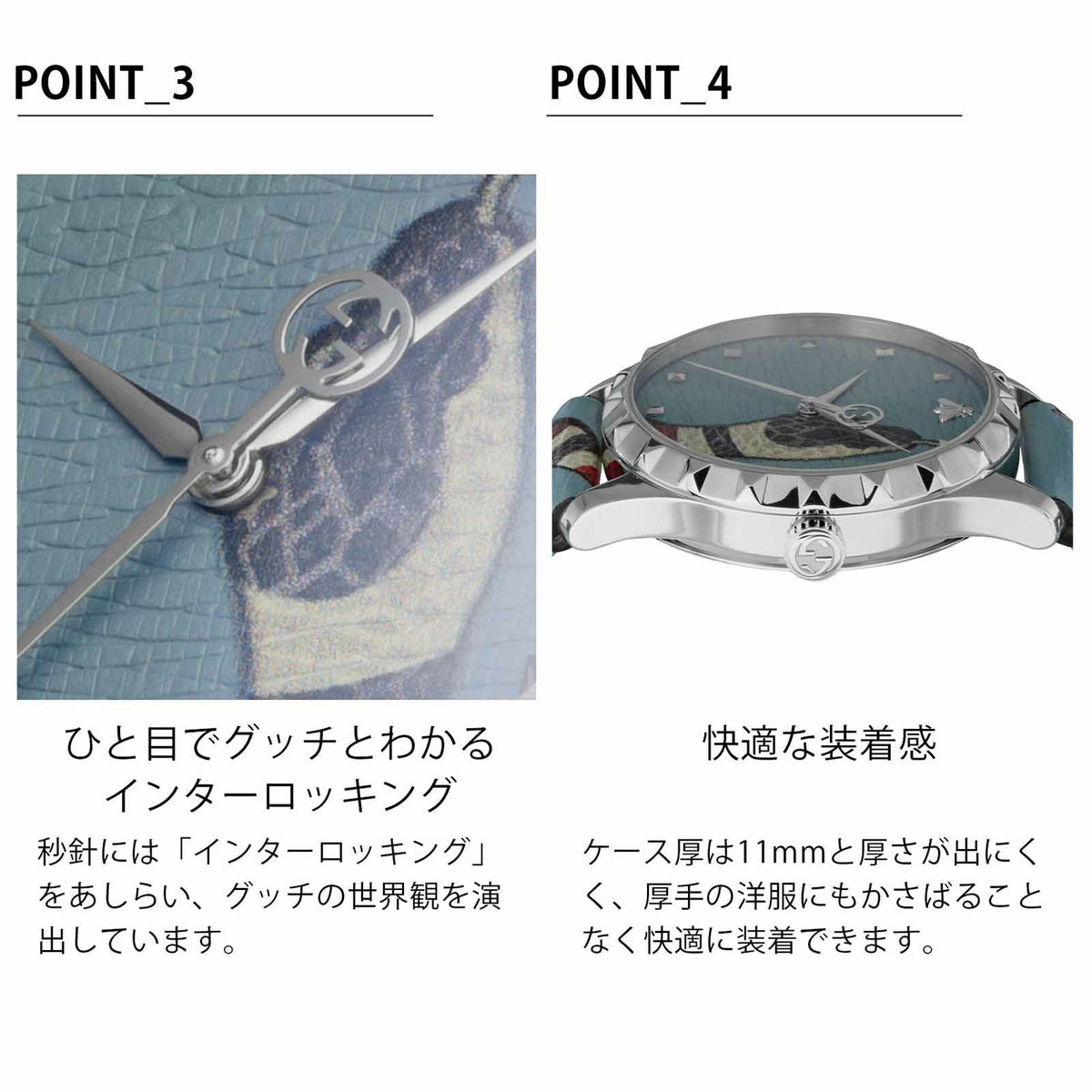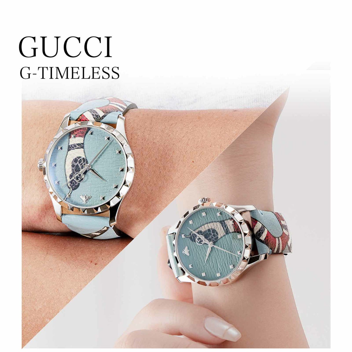 文字盤からつながるようにベルト部分にまで大胆にあしらわれたキングスネーク。12時位置にはグッチを象徴するビー(蜂)のスタッズを使用。グッチらしい遊びごころと貫禄が共存した1本です。ブラックとライトブルーの2色展開。