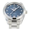 グロッシーミッドナイトブルーのダイアルが印象的な「シーマスター アクアテラ」レディスモデルです。34mmのシンメトリックなステンレススティール製ケースには、6時位置の日付表示を装備し、ロジウムプレートホルダーに11個のダイヤモンドをセットしたインデックスが配されています。ブレスレットはケースと一体化したステンレススティール製で、上品な佇まいを際立たせます。