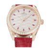 希少な素材を厳選して制作された「シーマスター アクアテラ」は、美しさを定義するジュエリーウォッチです。38mmのケースには18Kセドナゴールドを採用し、針にも同素材を使用しています。ベゼルにはダイヤモンドがセッティングされ、ダイアルには191個のダイヤモンドで描かれた波模様があしらわれています。また、アワーマーカーにはマーカスカットを施したレッドルビーを配しており、上品な輝きを楽しめます。