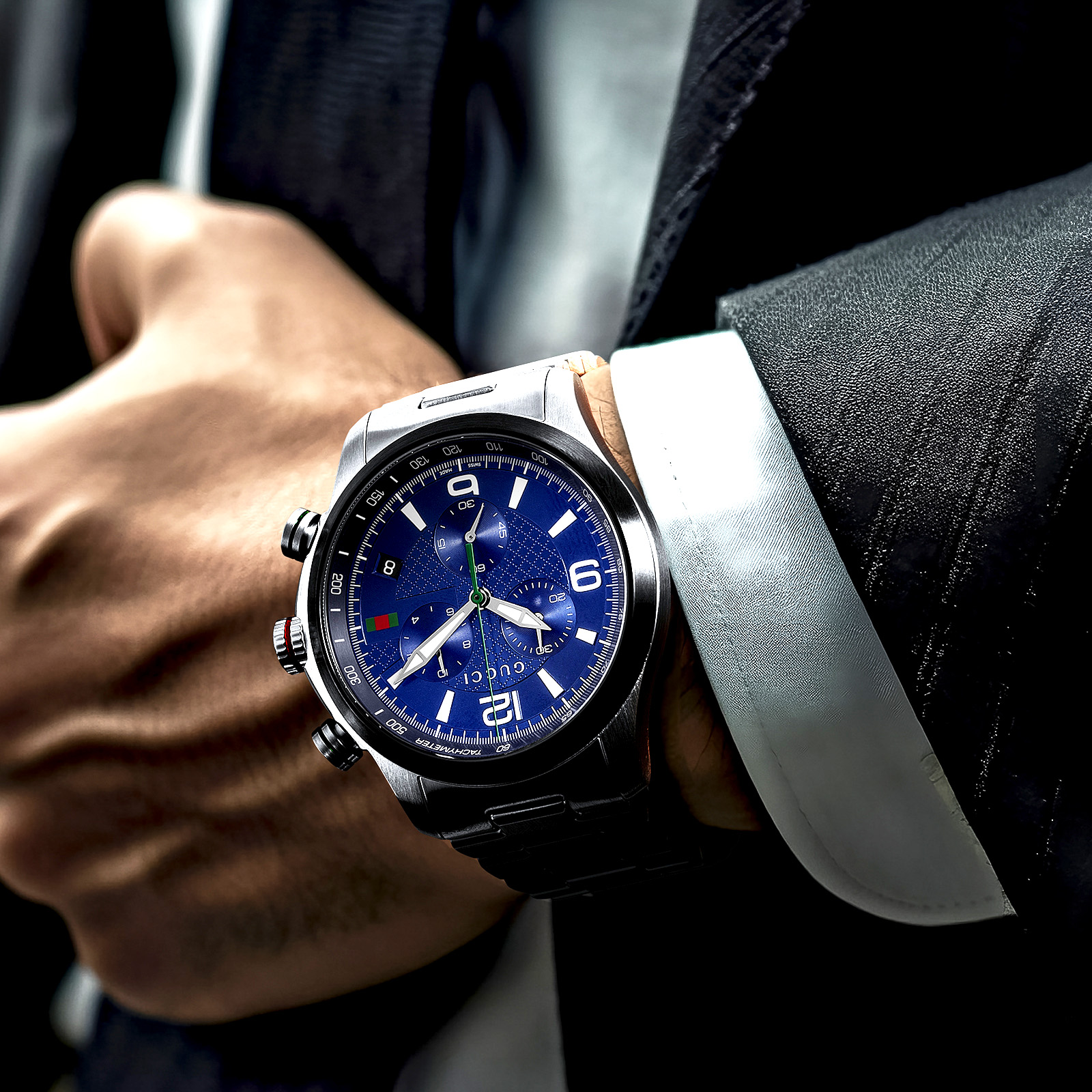 グッチらしい意匠が際立つクールなブルーダイヤル