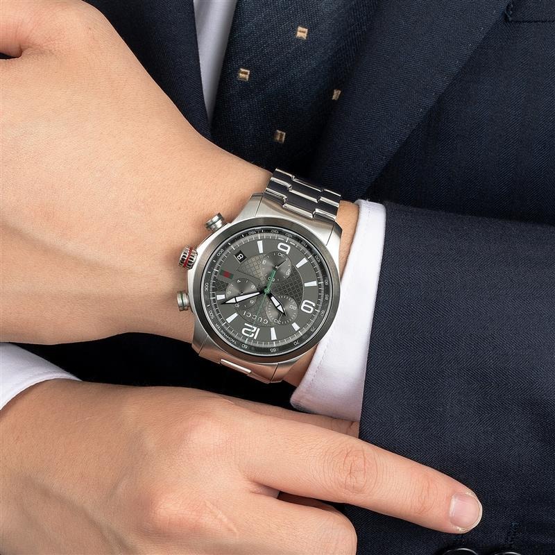 しかし、Gタイムレスクロノは、由緒正しきラグジュアリーなブランドからの出自。クロノグラフにありがちな、男臭さ、スポーティさだけではなく、ラグジュアリー感をも醸しています。となると、スタイリングにおける汎用性の高さはお墨付き。カジュアルスタイルからビジネスシーンまでシチュエーションを選びません。